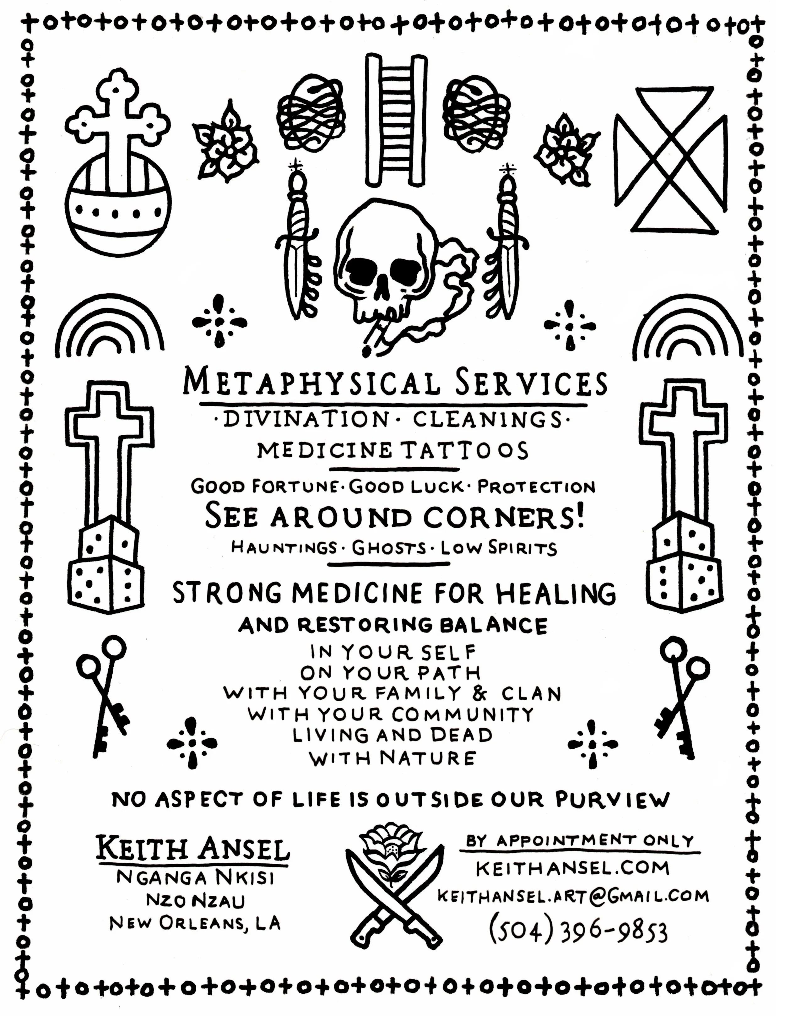 My name is Keith Ansel aka Sarabanda Luna Nueva. I’m a Nganga Nkisi (a healer and diviner) in a Traditional Spiritual Community and Bantu-Kongo Cult of Affliction (by way of Cuba) known as PALO located in New Orleans, LA, and I specialize in Traditional Tattooing.